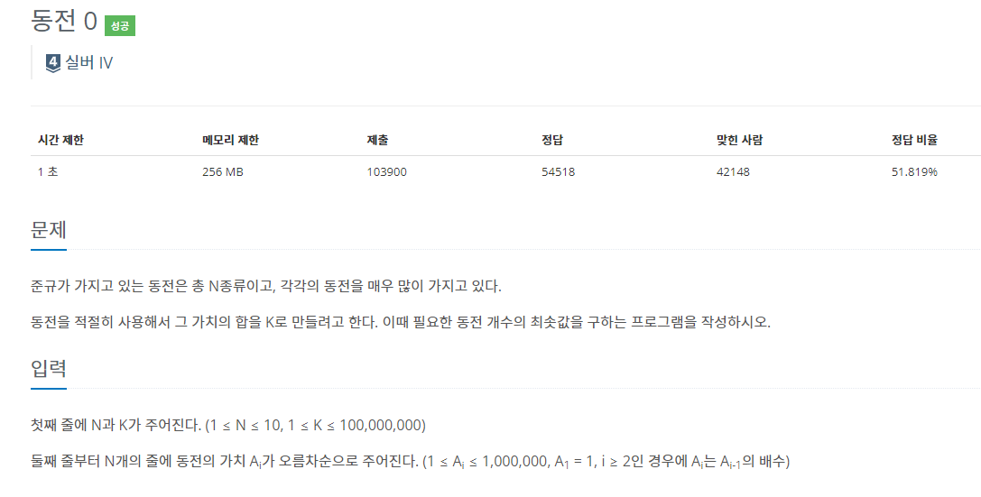 동전의 개수가 10을 넘지 않기 때문에 동적할당을 하지 않아도 되었는데, 나는 저 조건을 똑바로 읽지 않아서 동적할당을 해서 문제를 풀었다. 동전의 가치를 배열에 입력하면 오름차순으로 배열의 원소에 동전의 가치가 들어간다.