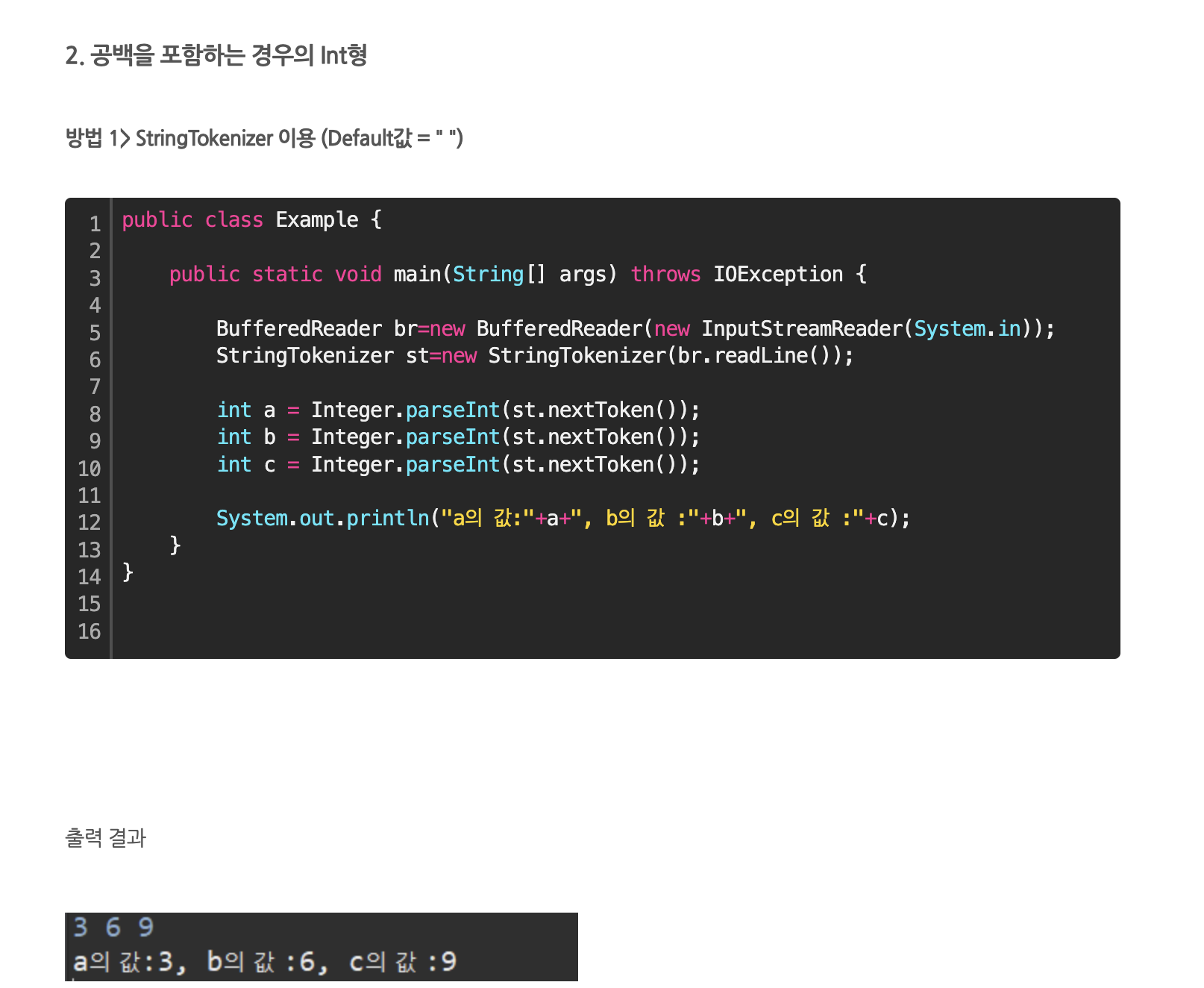 그래서 알고리즘 문제를 풀 때 한 줄에 공백으로 기준으로 나눠진 정수가 주어지는 상황에서는 StringTokenizer를 필수적으로 사용해야 합니다.