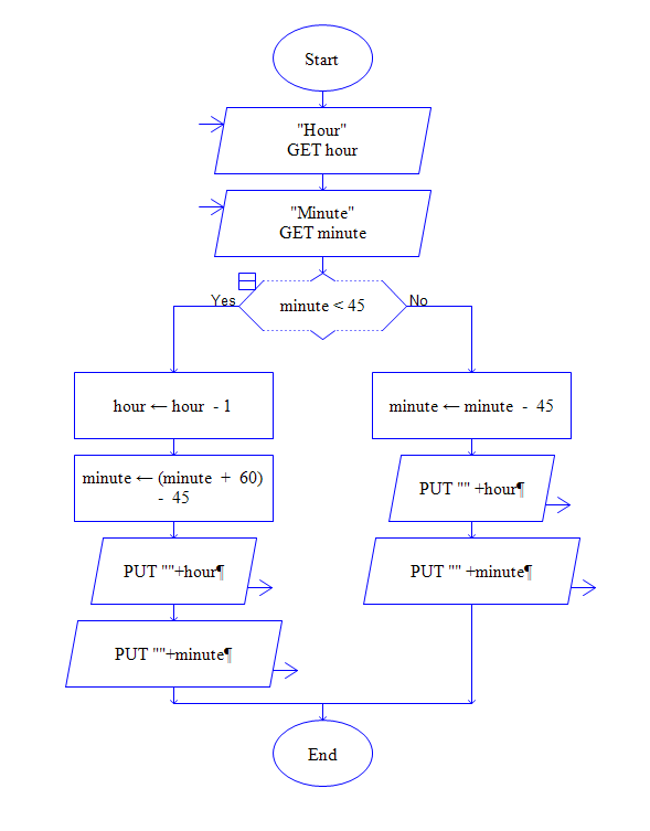 그래서 if문을 사용하여 설정한 시각이 45분보다 빠를 때, '시'에서 1을 빼고 한시간이 60분이니 (minute + 60) -45 를 한다.