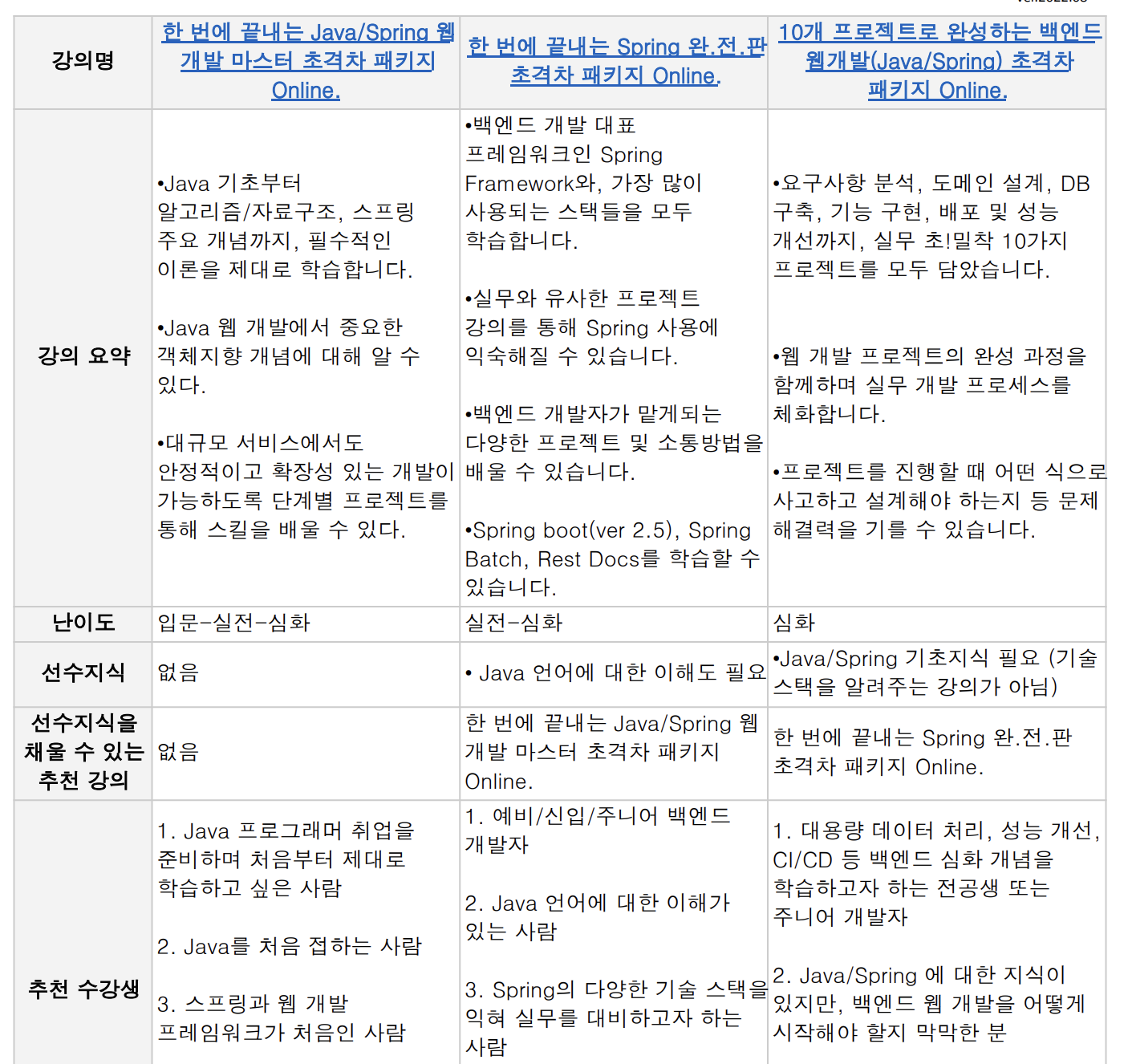 어떤 순서로 들어야 효율적일지 고민하다가 패스트캠퍼스 홈페이지에서 강의비교시트를 발견했다.