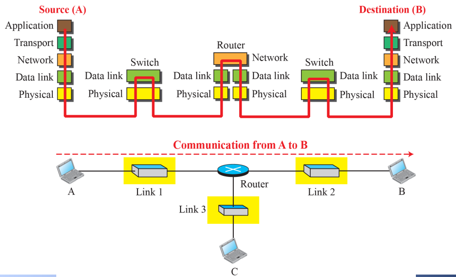 A와 B가 통신을 할 때 발신지 호스트는 응용계층에서 메시지를 생성하고 그것을 아래 계층들에게 보냄으로써 메시지가 물리적으로 목적지 호스트까지 보내진다. 목적지 호스트는 물리 계층에서 통신을 받고 그것을 다른 계층들을 거쳐 응용 계층으로 전달한다.