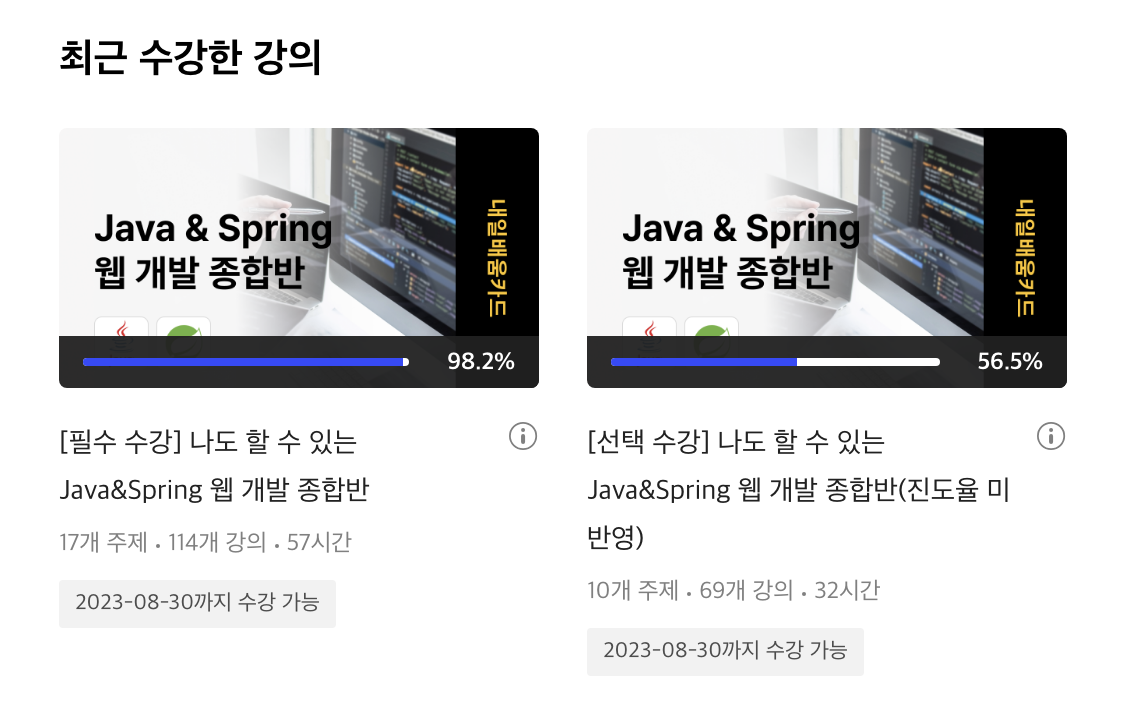 야놀자 테크스쿨이 7월 10일에 시작했고 현재 약 100일 가량 지났다. 지금까지 해왔던 공부들을 정리하고 앞으로 어떻게 공부할지 계획을 하고자 이 글을 쓴다. 1. 지금까지 했던 것 김영한 스프링 입문, 핵심원리 완강(Spring Framework에서 제공하는 기능에 대한 이해) 남궁성 스프링의 정석 완강 (Spring에 대한 기본적인 이해, CRUD 게시판 실습) 남궁성 자바의 정석 (자바 문법에 대한 이해) 스프링 입문을 위한 객체지향의 원리와 이해(자바와 스프링 기초, 디자인 패턴에 해서 학습) SQLD 시험 응시 (시험 준비를 너무 늦게 시작해서 합격할 수 있을지는 미지수지만, DB에 대해서 깊게 공부해봤음(반정규화, 서브쿼리 조인 등) 현재 진행 중인 공부 모던 자바 인 액션( 동작 파라미터화..